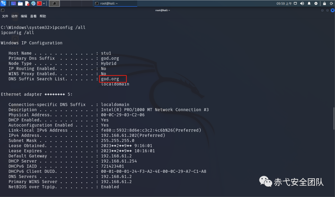 1)先判断是否存在域,使用ipconfig /all查看DNS服务器,发现主DNS后缀不为空,存在域god.org,如下图所示。