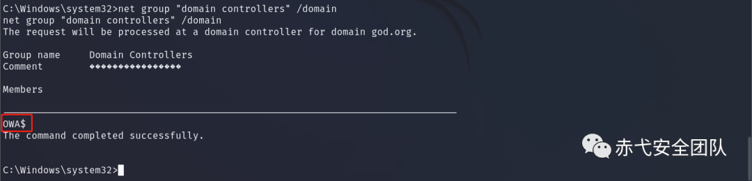 3)既然只有一个域,那就利用net group "domain controllers" /domain,来查看域控制器主机名,直接确认域控主机的名称为OWA:
