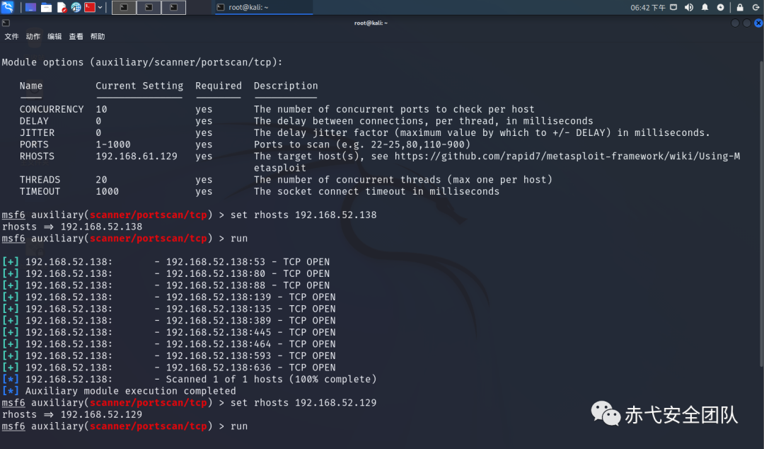 use auxiliary/scanner/portscan/tcpset RHOSTS 192.168.52.138