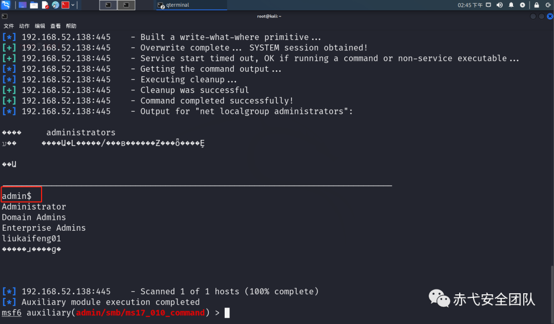 3)我们使用use auxiliary/admin/smb/ms17_010_command模块执行以下命令,看看能否回显。