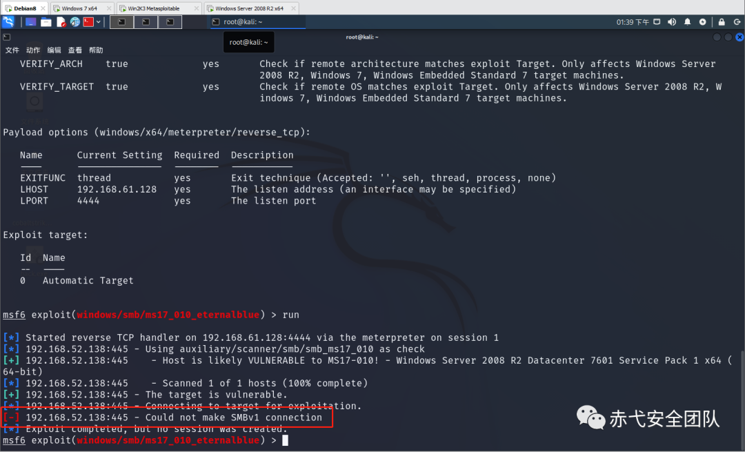 1)之前我们进行use auxiliary/scanner/portscan/tcp,进行端口扫描的时候,发现两台内网主机都开启了445端口,接下我我们对域控192.168.61.138,进行漏洞扫描。