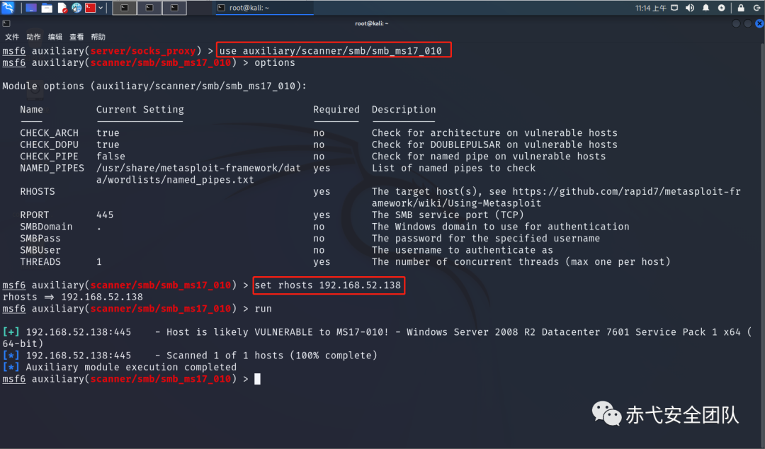 2)我们使用use auxiliary/scanner/smb/smb_ms17_010模块进行扫描,发现存在漏洞。