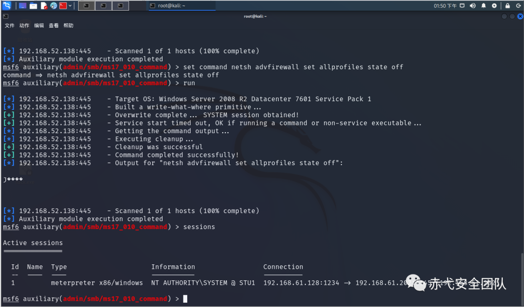 5)我们回到MS17-010_command模块,set命令开启3389端口,关闭防火墙。