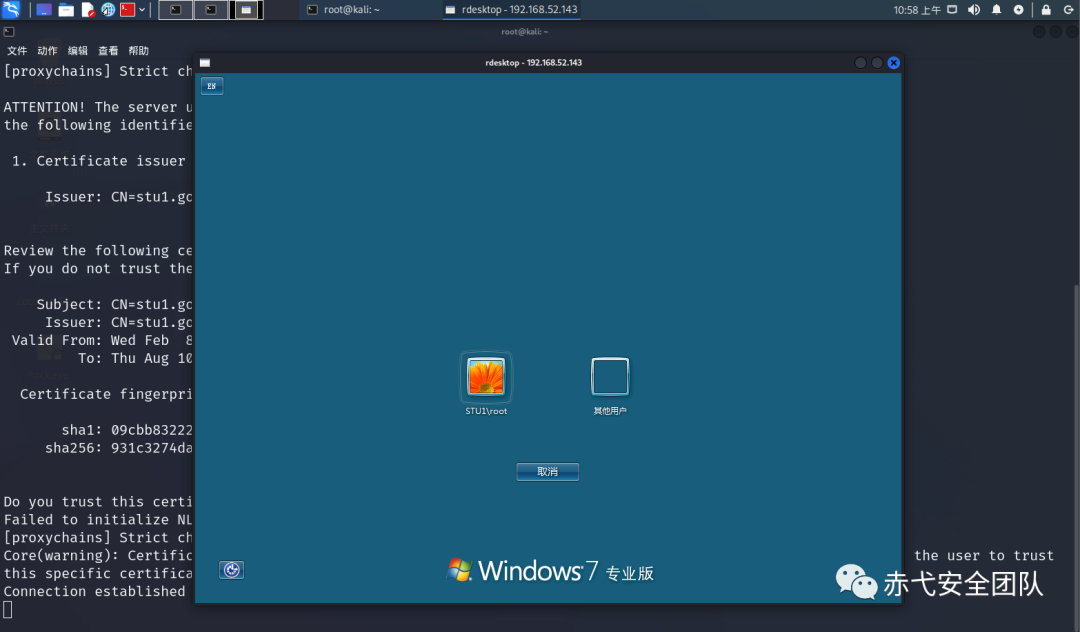 proxychains4 rdesktop 192.168.52.143这里配合mimikatz抓取的密码,远程登陆到主机,这里链接的话,会把靶机挤掉,这里就不链接了。