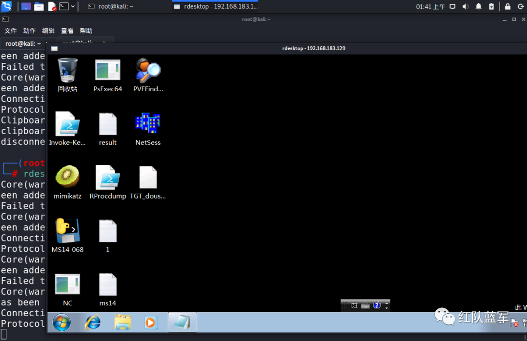 我们这里拿到了一个域用户权限之后可以提取出有用的信息,如SID,口令,用户名,域全名等,因此可以利用ms14-068工具生成票据然后利用mimikatz导入: