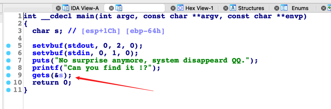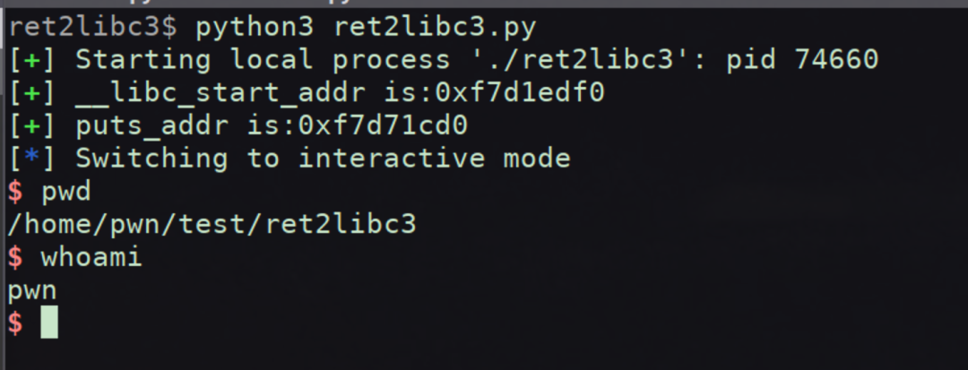 __libc_start_main函数在内存空间中的地址addr_main__libc_start_main函数相对于libc.so.6的起始地址是addr_main_offsetlibc.so.6的起始地址是addr_system_offsetsystem函数在内存中真正的地址为addr_main+addr_system_offset-addr_main_offset__libc_start_main函数的地址__libc_start_main函数在got表的地址_start函数的地址puts函数在plt表中的地址__libc_start_main函数在got表中的地址_start函数的地址puts函数在plt表中的地址puts函数后,ret到main函数,用main函数里面的gets来获取libc_start的地址from pwn import *