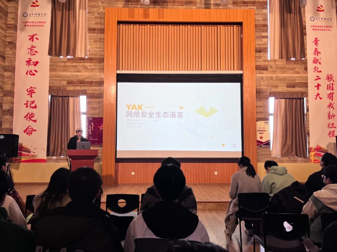 3月3日,电子科技大学网络空间安全研究院携手Yaklang.io团队,首次带领网络安全领域专属编程语言CDSL-YAK走进高校校园,面向23级图灵班学生全面介绍了YAK的核心能力、技术理念、语法特点以及实践应用,旨在营造高校网络安全技术交流氛围,搭建高校人才技术交流平台,赋能行业人才安全能力建设,希望有更多的学生了解并参与到安全行业中,成为网络安全的新生力量,为构建网络空间命运共同体添砖加瓦。