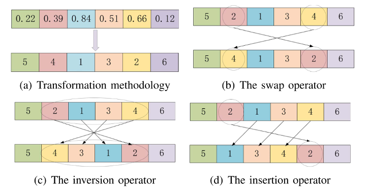 随机选择三个突变算子(即交换、反转和插入),以基于预定义的概率(如0.2、0.5、0.3)决定将执行哪个操作生成初始生物体。例如,生成范围为(0,1)的随机值p_0。如果p_0<0.2,则使用交换运算符修改给定生物体。在执行突变算子之前,随机选择给定生物体中的两个位置,交换两个位置;反转操作反转两个位置之间的局部片段;插入运算符将区域从第一个位置移动到第二个位置。图5给出了三个操作的图解。下面是共生生物搜索的主体过程。