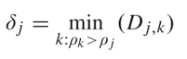 在本文中,给定区域T_j的密度rho_j被定义为在预定义范围内搜索所有区域的平均时间成本。截止距离delta_j表示区域T_j与密度高于它的其他区域之间的最小距离。