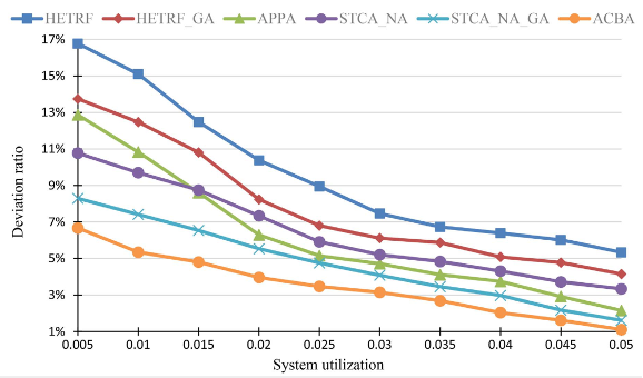 在图9中,通过改变系统利用率来测试方法的偏差率。这些实验中采用的区域生成参数为n=30和d=0.9。六种方法的偏差率随着系统利用率的下降而下降。由于在路径规划算法中无法优化UAV的扫描时间成本,因此更大比例的扫描时间有利于更精确的解决方案。因此,偏差率随着系统利用率的降低而降低。可以看到,当系统利用率值为0.02时,本文的方法、HETRF、HETRF_GA、APPA、STCA_NA和STCA_NA_GA的平均偏差率分别为3.96%、10.38%、8.23%、6.29%、7.34%和5.53%,这表明本文方法在给定的系统利用率下具有最小的偏差率。