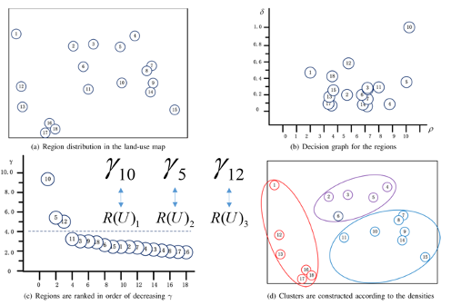 根据密度和距离的值来选择聚类中心。考虑一个真实场景,采用三个架UAV完全搜索18个区域,以检测中国福州市的土地利用类型,感兴趣的区域位于二维地图中,如图3(a)所示。首先,计算每个区域的密度和距离,并在图3(b)中构建决策图,为更准确和有效地选择中心,使用数量 来评估密度和距离的综合影响。在聚类中心选择过程中,gamma值较大的区域将以较高的概率被选择。图3(c)按gamma值降序排列区域。可以看出,非中心区域的γ值有平滑的移动,并且从中心区域到非中心区域有明显的跳跃。这种跳跃可以有效地指导中心的选择。