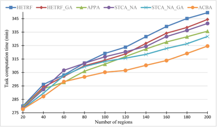 在图6中,本文的方法和五种现有方法的任务完成时间通过将区域数量从20逐渐增加到200来评估。在这些实验中,当系统利用率为0.025,系统阻力系数为0.5,即u=0.025,d=0.5时,随机生成区域。六条曲线分别是基于时空聚类的最接近策略(STCA_NA)、基于遗传算法的顺序优化策略(STCA-NA_GA)、最高有效时间比优先算法(HETRF)、具有基于遗传算法优化策略的改进HETRF算法(HETRF_GA)和基于蚁群系统(ACS)的路径规划算法(APPA)。