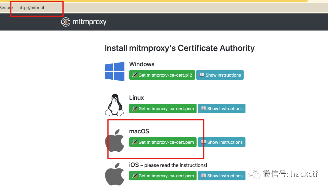 即可监听socks5://127.0.0.1:8889。使用SwitchOmega等插件连接该代理,并访问mitm.it即可进入证书安装页面,根据操作系统进行证书安装。![]()