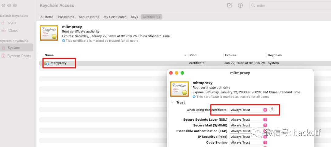 下载安装后,打开钥匙串访问,找到mitmproxy证书,修改为alwaystrust![]()