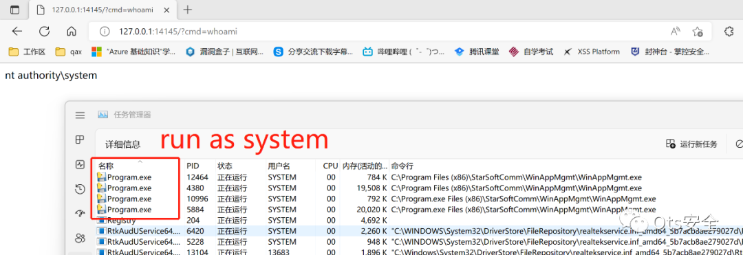 当我看到 Windows 应用程序管理服务在 Taskmgr.exe whit SYSTEM 中启动时,然后我可以打开浏览器输入http://127.0.0.1:14145?cmd=whoami