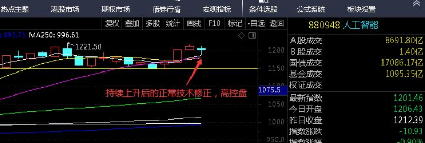 一、我们先从人工智能板块的指数运行来看。该指数前三天出现了一个上升较强的K线组合,但昨天出现了一个停顿的状态。不管今天是否有浪潮信息这个中军跌停的影响,光从指数的K线形态来看,也有技术面调整修正的要求。同时我们可以看到,今天该指数回踩到了5日线后有所上收,结合周K线来看,本周是中阳K线,反包了上周的K线,且本周的收盘位置也是近4周以来的最高点。因此从板块指数来看,这里暂时没有必要看空,非常标准的技术走法,也是大资金控盘整个人工智能主流的走法,我也是非常惊叹这一次大主力的运筹帷握的精准度。从这一点来看,人工智能还没有走完。