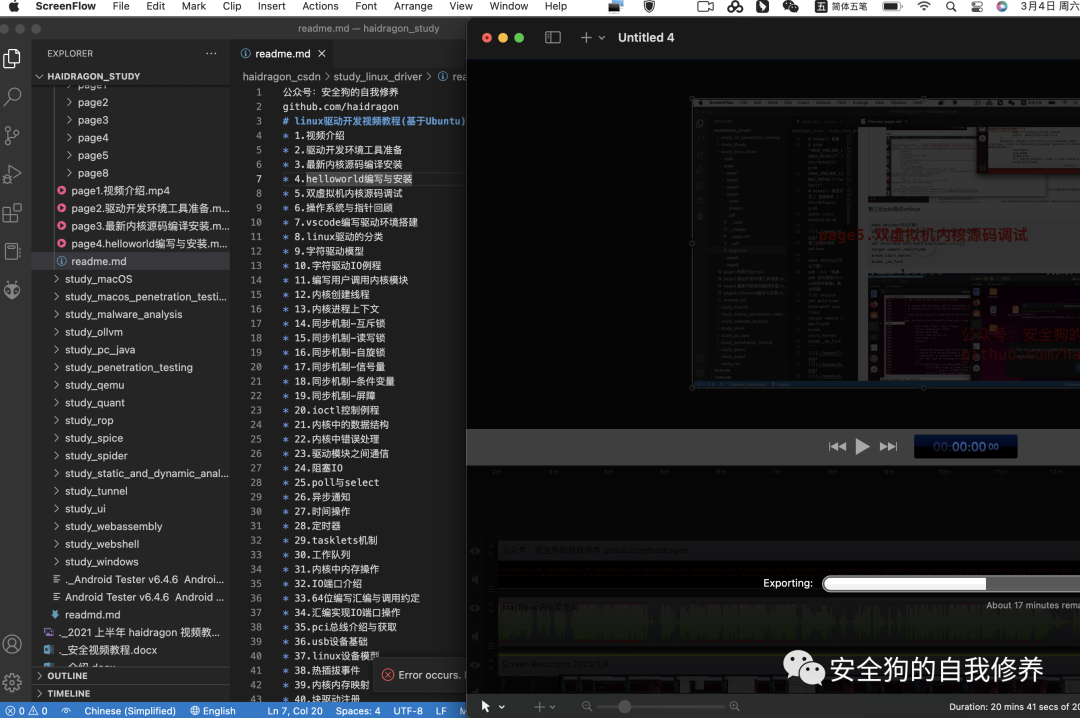 公众号:安全狗的自我修养github.com/haidragon# linux驱动开发视频教程(基于Ubuntu)5.双虚拟机内核源码调试* 1.视频介绍* 2.驱动开发环境工具准备* 3.最新内核源码编译安装* 4.helloworld编写与安装* 5.双虚拟机内核源码调试* 6.操作系统与指针回顾* 7.vscode编写驱动环境搭建* 8.linux驱动的分类* 9.字符驱动模型* 10.字符驱动IO例程* 11.编写用户调用内核模块* 12.内核创建线程* 13.内核进程上下文* 14.同步机制-互斥锁* 15.同步机制-读写锁* 16.同步机制-自旋锁* 17.同步机制-信号量* 18.同步机制-条件变量* 19.同步机制-屏障* 20.ioctl控制例程* 21.内核中的数据结构* 22.内核中错误处理* 23.驱动模块之间通信* 24.阻塞IO* 25.poll与select* 26.异步通知* 27.时间操作* 28.定时器* 29.tasklets机制* 30.工作队列* 31.内核中内存操作* 32.IO端口介绍* 33.64位编写汇编与调用约定* 34.汇编实现IO端口操作* 35.pci总线介绍与获取* 36.usb设备基础* 37.linux设备模型* 38.热插拔事件* 39.内核内存映射* 40.块驱动注册* 41.网络驱动开发* 42.TTY驱动开发