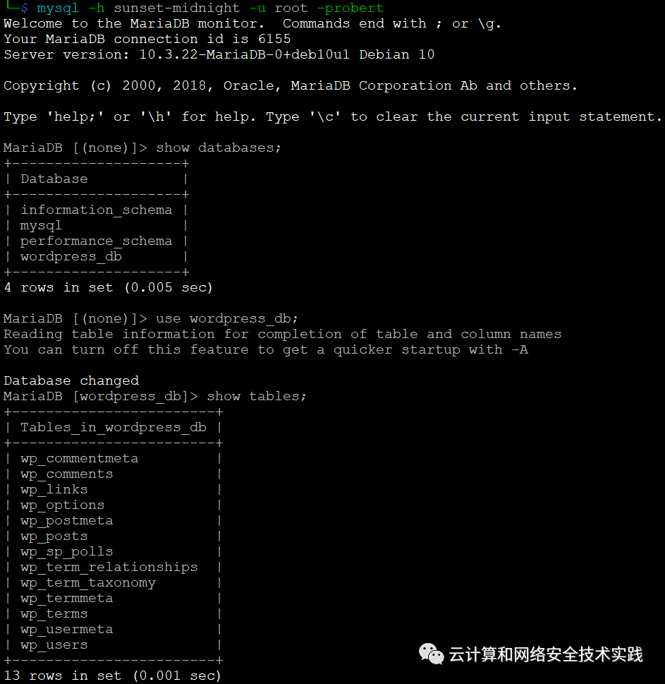 访问mysql服务,mysql -h sunset-midnight -u root -probert,