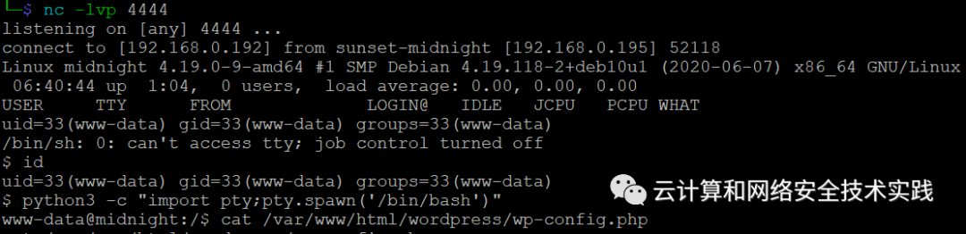 浏览器访问http://sunset-midnight/wp-content/themes/twentynineteen/404.php,反弹shell这就过来了,不是root权限,需要提权,