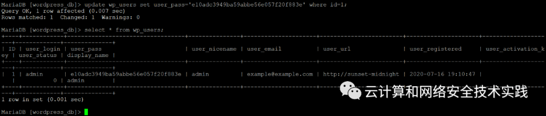 更新后台管理员的密码,update wp_users set user_pass='e10adc3949ba59abbe56e057f20f883e' where id=1;