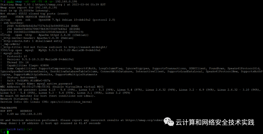 再继续做端口扫描,sudo nmap -sS -sV -T5 -A -p- 192.168.0.195,