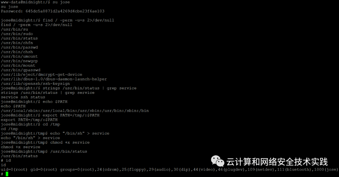 切到jose,查找root权限执行的程序,find / -perm -u=s 2>/dev/null,