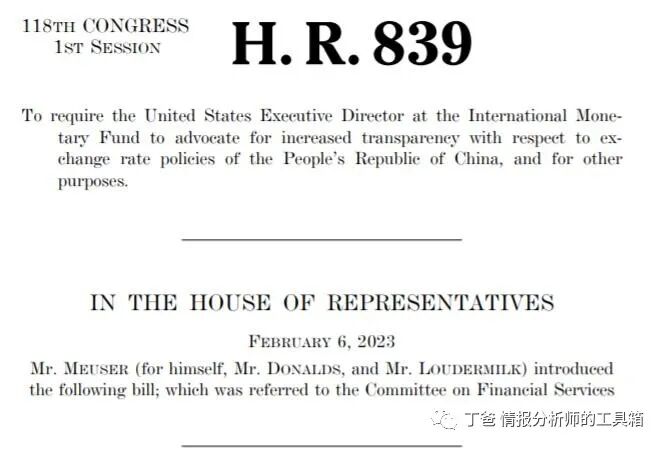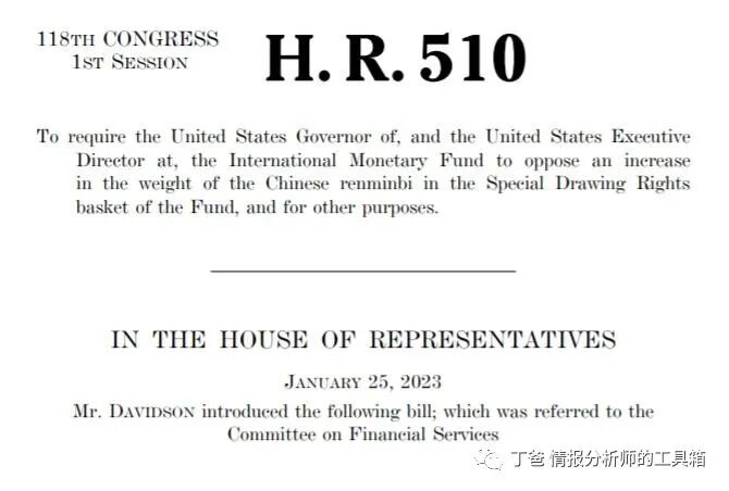 10、戴维森提出的《中国货币问责法》,要求国际货币基金组织的美国总督和美国执行主任反对增加人民币在基金特别提款权篮子中的比重,并为其他目的。