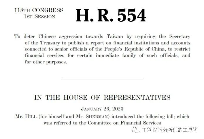 3、希尔和谢尔曼提出的《台湾冲突威慑法》,要求财政部长就与中国高级官员有联系的金融机构和账户发表报告,限制这类官员某些直系亲属的金融服务以及其他目的,以阻止台海冲突。