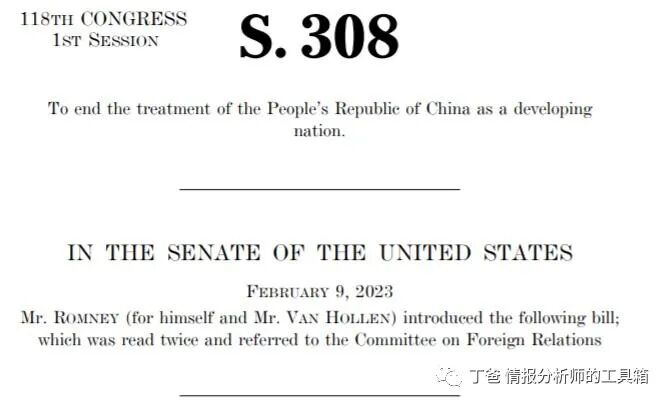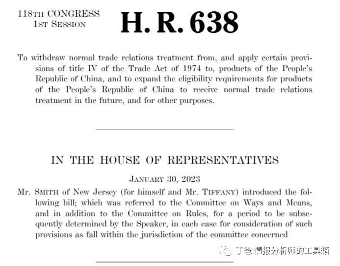 4、史密斯提出的《2023年中国贸易关系法》,撤销对 1974 年《贸易法》第 IV 条的某些条款对中国产品的正常贸易关系待遇,并为其他目的扩大对中国产品的资格要求,以便今后获得正常贸易关系待遇。