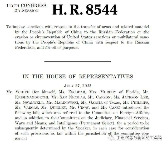 11、希夫等人提出的《阻止中华人民共和国支持俄罗斯战争努力法》,要求对中国向俄罗斯联邦转让军火和有关物资或中国逃避或规避美国对俄罗斯联邦的制裁或多边制裁及其他目的实施制裁。