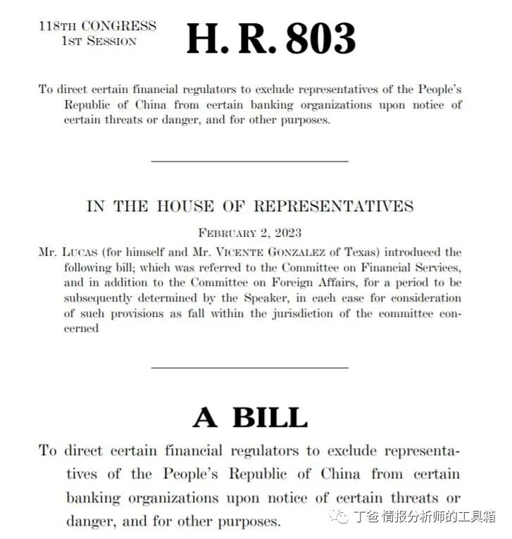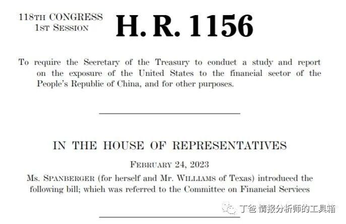 5、斯潘伯格和威廉姆斯提出的《中国金融威胁减少法》,要求财政部长就美国暴露于中国金融部门的情况及其他目的进行研究,并提出报告。