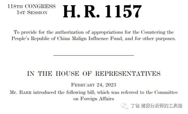 7、巴尔提出的《马里影响基金授权法》,旨在就拨付“打击中国恶意影响基金”及其他用途的拨款作出规定。