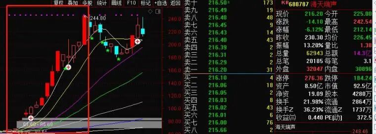 1:海天瑞声,前期市场最耀眼的股票,阶段最高涨幅266%,其中只有4个涨停板,当然它是20厘米的,10厘米的可以类似分析的;