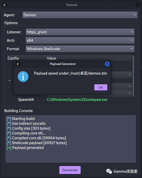 接着点击Attack - Payload选择Windows Shellcode,点击Generate将shellcode保存