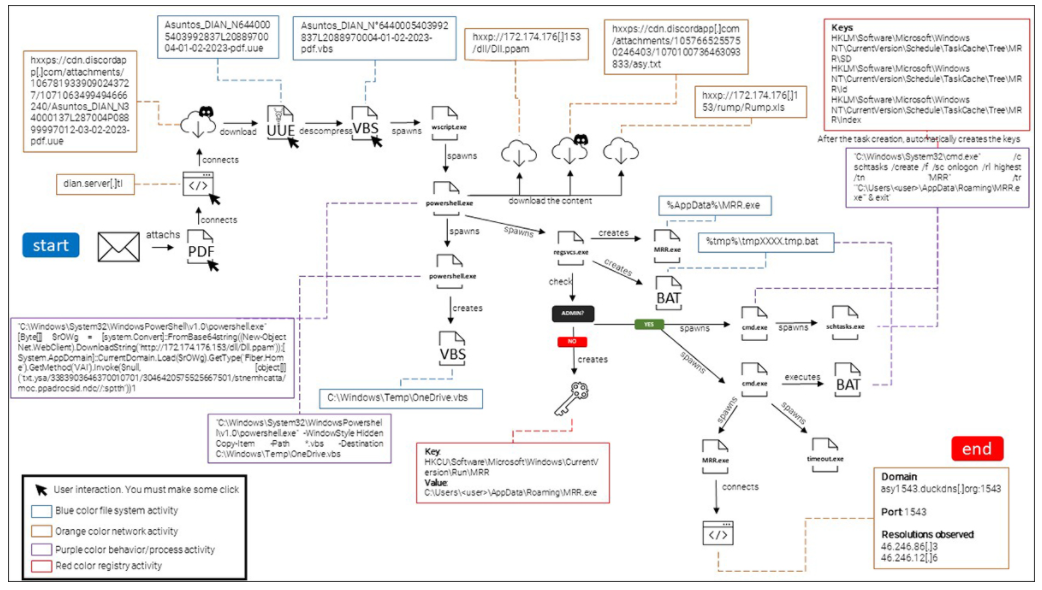 APT-C-36(也称为盲眼鹰)至少自 2019 年以来一直在积极瞄准哥伦比亚和厄瓜多尔的组织,依靠发送给特定公司的鱼叉式网络钓鱼电子邮件来开展攻击活动。2 月 20 日,黑莓研究和情报团队发现了一起新的活动,攻击者冒充哥伦比亚政府税务机构,针对哥伦比亚的关键行业展开攻击,包括该国内卫生、金融、执法、移民和负责和平谈判的机构。感染的初始媒介是通过电子邮件发送的 PDF 附件,与以往钓鱼不同的是网络钓鱼电子邮件的发件人选择使用密件抄送 (BCC) 字段而不是收件人字段,将骗局发送至哥伦比亚波哥大商会网站的官方电子邮件地址。钓鱼邮件以拖欠了 45 天的税款为诱饵,诱使目标点击链接查看包含他们的加密发票文档。PDF 包含的 URL 不同于指向以往虚假的钓鱼链接,链接显示的的合法超链接。但是,如果用户点击真实的 URL,将被重定向到另一个网站,然后这个新站点的 URL 字段包含一个从公共服务 Discord 下载第二阶段有效负载的 URL。![]()