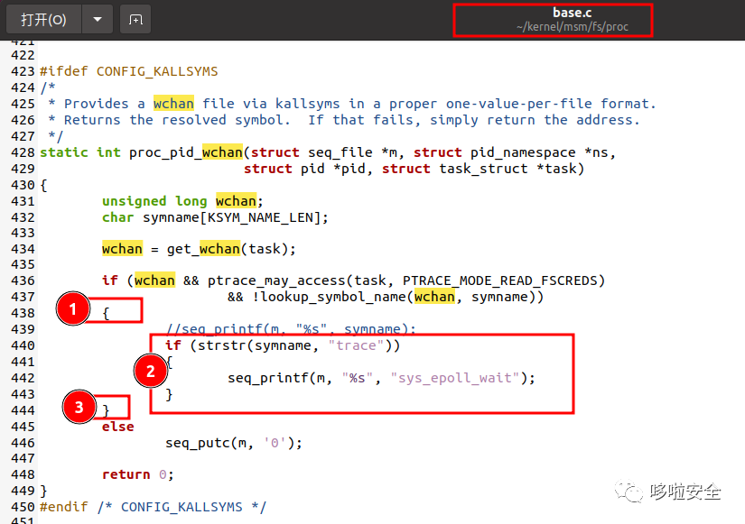 /** Provides a wchan file via kallsyms in a proper one-value-per-file format.* Returns the resolved symbol. If that fails, simply return the address.*/static int proc_pid_wchan(struct seq_file *m, struct pid_namespace *ns,struct pid *pid, struct task_struct *task){unsigned long wchan;char symname[KSYM_NAME_LEN];wchan = get_wchan(task);if (wchan && ptrace_may_access(task, PTRACE_MODE_READ_FSCREDS)&& !lookup_symbol_name(wchan, symname)){//seq_printf(m, "%s", symname);if (strstr(symname, "trace")){seq_printf(m, "%s", "sys_epoll_wait");}}elseseq_putc(m, '0');return 0;}
