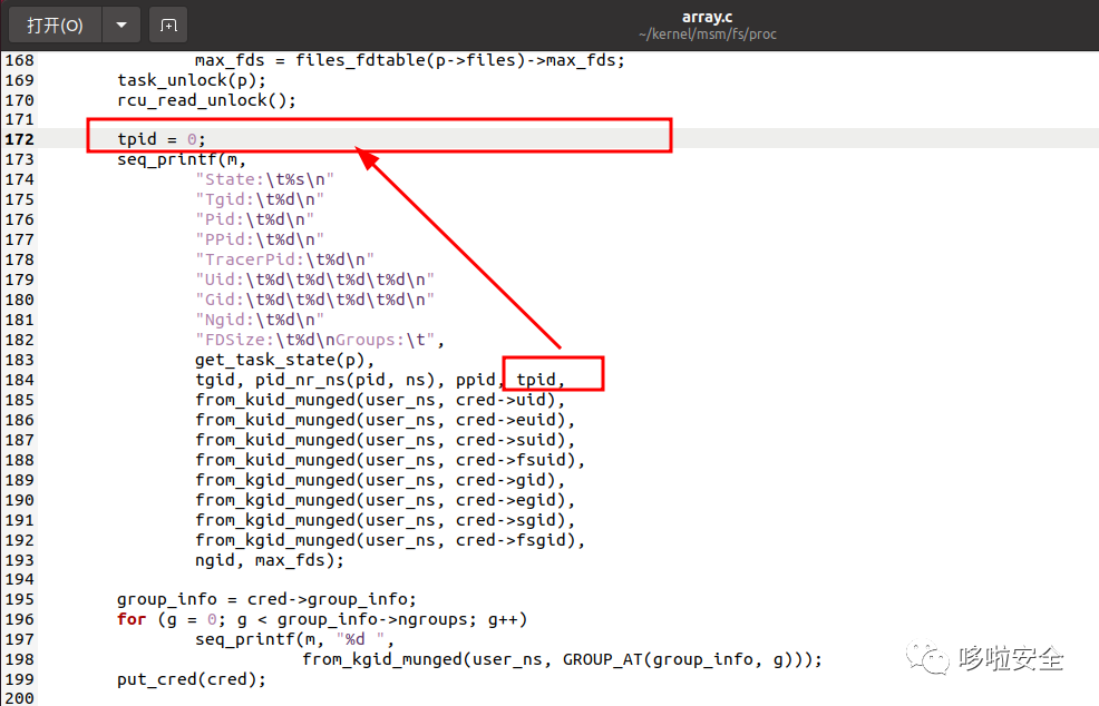 tpid = 0;seq_printf(m,"State:\t%s\n""Tgid:\t%d\n""Pid:\t%d\n""PPid:\t%d\n""TracerPid:\t%d\n""Uid:\t%d\t%d\t%d\t%d\n""Gid:\t%d\t%d\t%d\t%d\n""Ngid:\t%d\n""FDSize:\t%d\nGroups:\t",get_task_state(p),tgid, pid_nr_ns(pid, ns), ppid, tpid,from_kuid_munged(user_ns, cred->uid),from_kuid_munged(user_ns, cred->euid),from_kuid_munged(user_ns, cred->suid),from_kuid_munged(user_ns, cred->fsuid),from_kgid_munged(user_ns, cred->gid),from_kgid_munged(user_ns, cred->egid),from_kgid_munged(user_ns, cred->sgid),from_kgid_munged(user_ns, cred->fsgid),ngid, max_fds);