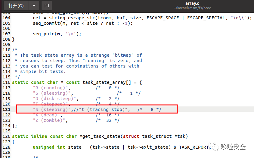 /** The task state array is a strange "bitmap" of* reasons to sleep. Thus "running" is zero, and* you can test for combinations of others with* simple bit tests.*/static const char * const task_state_array[] = {"R (running)", /* 0 */"S (sleeping)", /* 1 */"D (disk sleep)", /* 2 */"T (stopped)", /* 4 */"S (sleeping)",//"t (tracing stop)", /* 8 */"X (dead)", /* 16 */"Z (zombie)", /* 32 */};