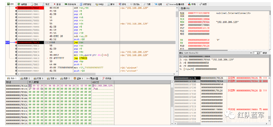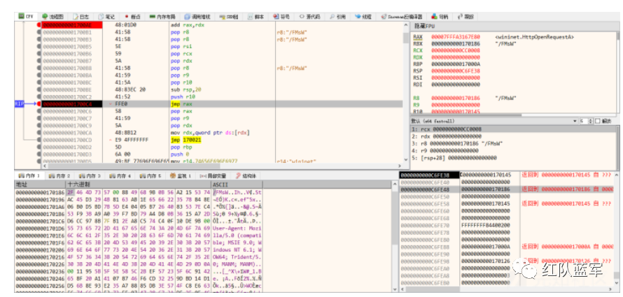 解密后的 shellcode 可以通过 CreateThread 的传参找到,起始地址保存在 R9 寄存器中: