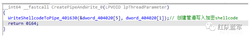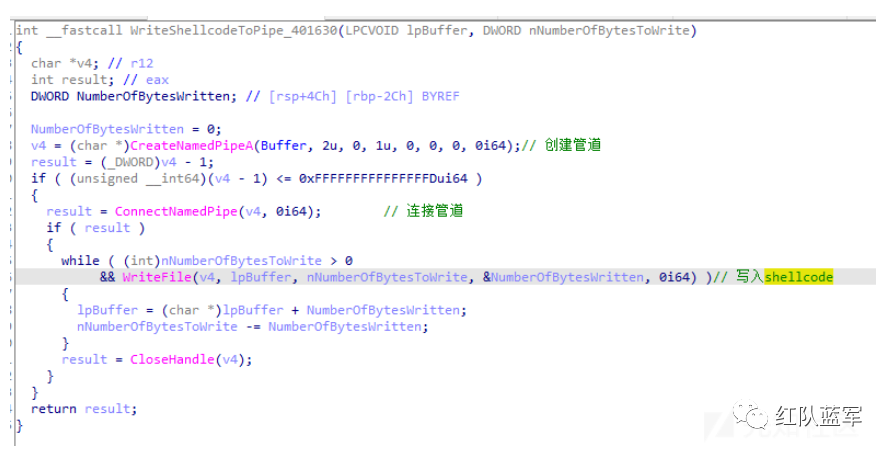 跟进 WriteShellcodeToPipe_401630,创建管道并循环写入 shellcode: