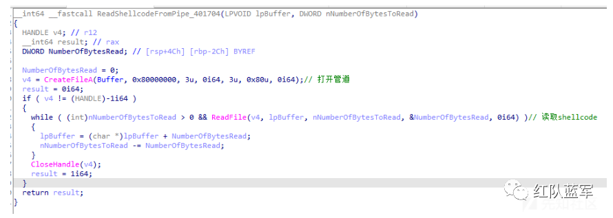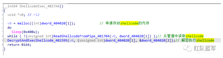 跟进 ShellcodeExec_4017A6 函数,该函数实现从管道接收 shellcode 并解密执行: