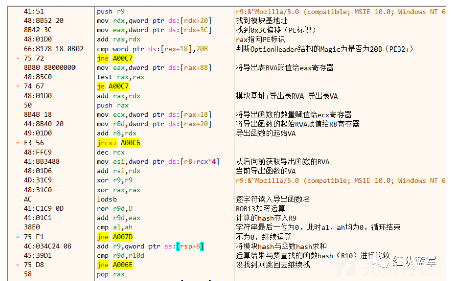 | cmp r9d,r10d | 运算结果与要查找的函数hash(R10)进行比较