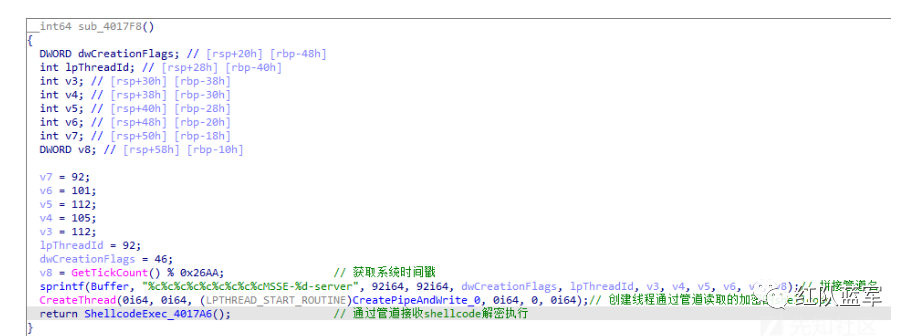 进入 sub_4017F8 函数,先获取系统时间戳,然后创建线程通过管道读取 shellcode 并执行: