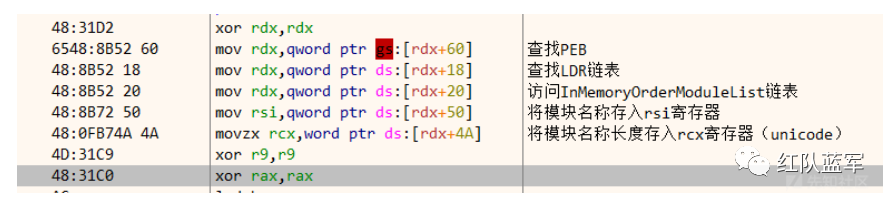 | mov rdx,qword ptr ds:[rdx+20] | 访问InMemoryOrderModuleList链表