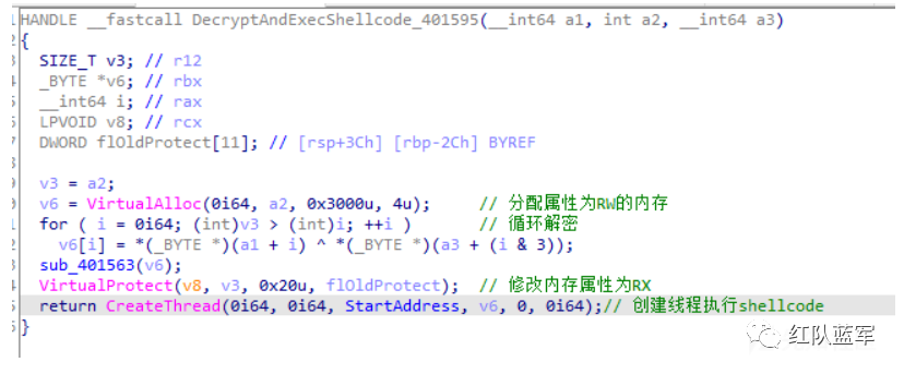 将读取到的 shellcode 在 DecryptAndExecShellcode_401595 函数中解密执行: