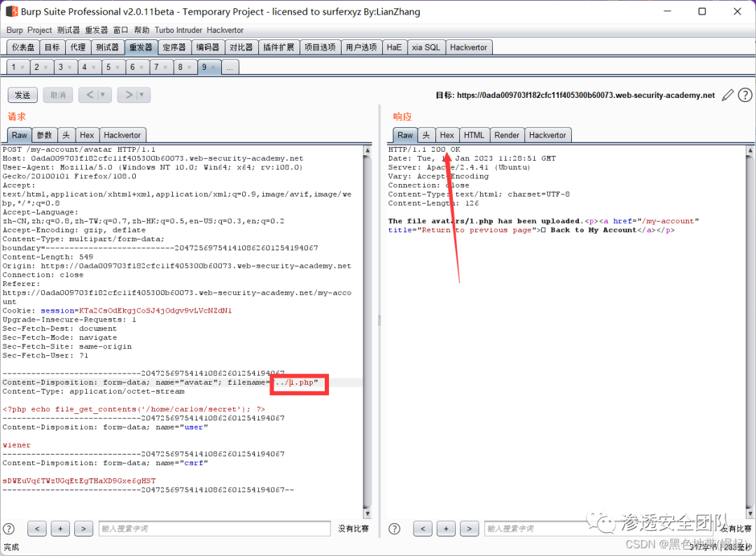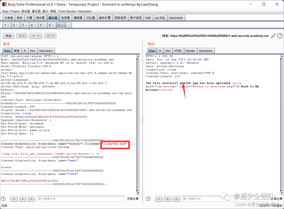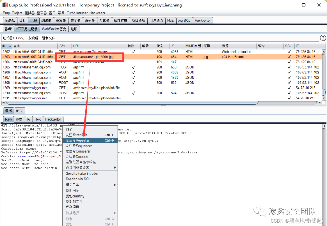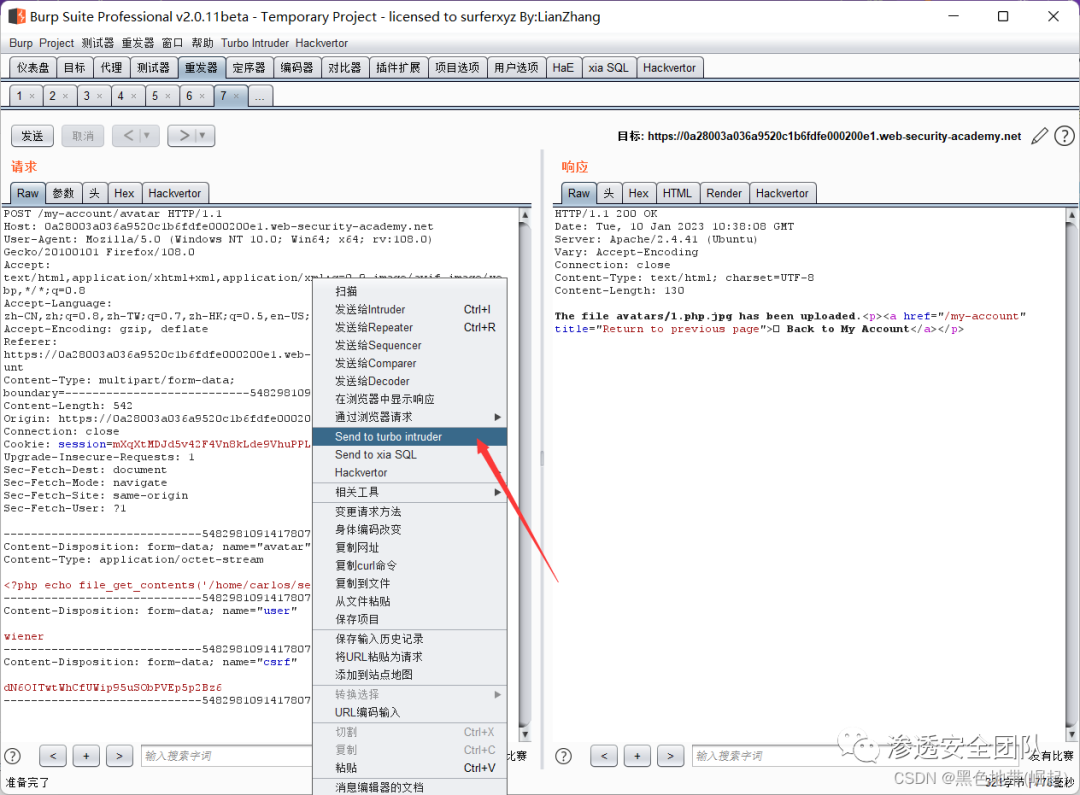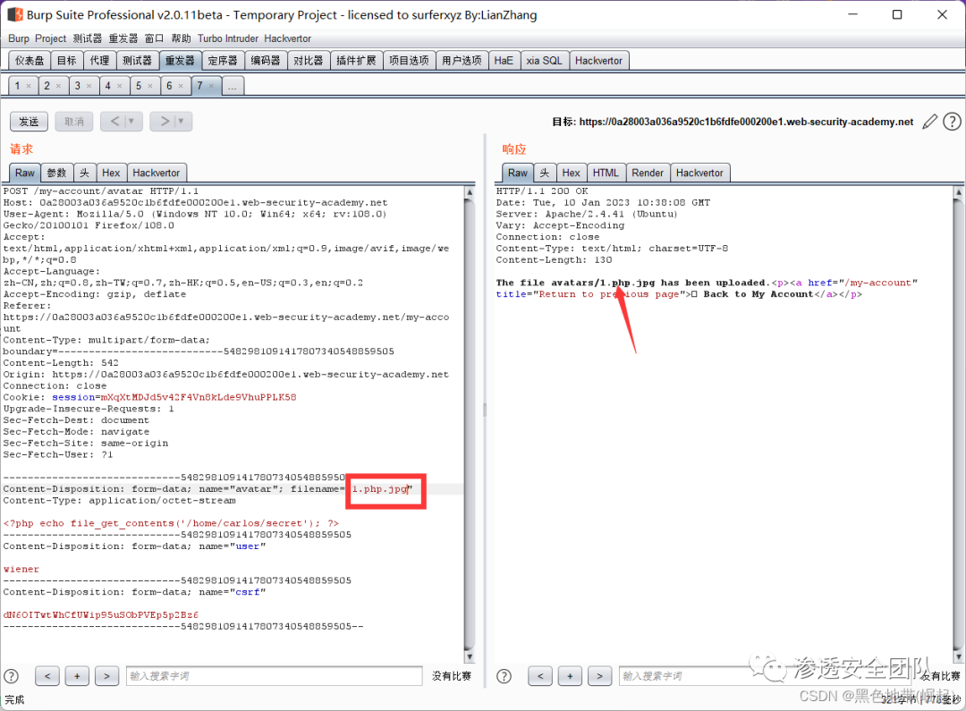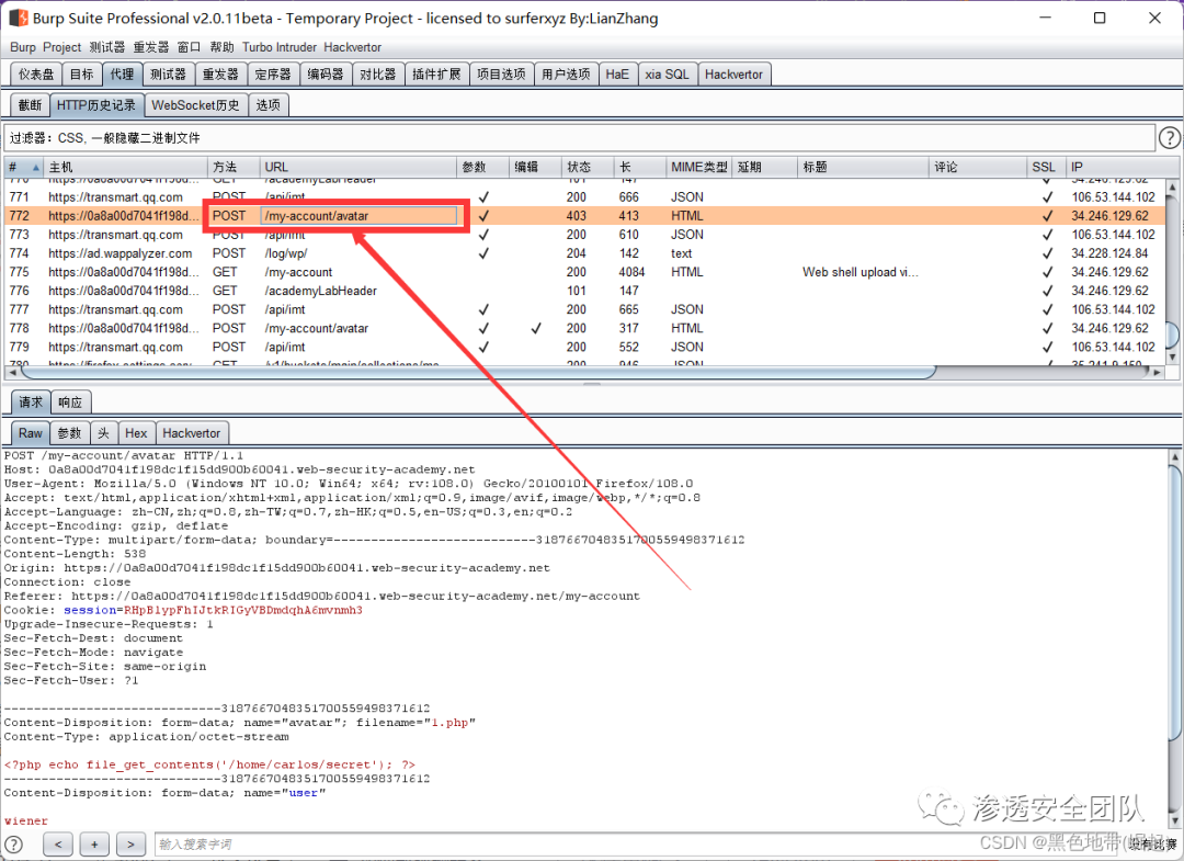 在Burp的HTTP历史记录中,找到用于提交文件上传的POST/my-account/avatar请求。把这个发给repeater